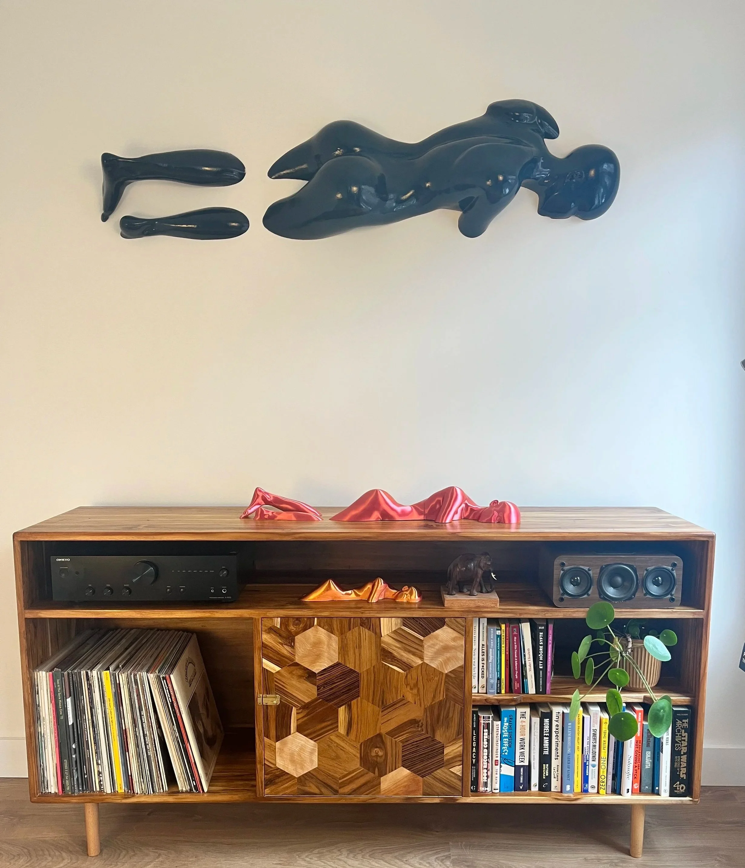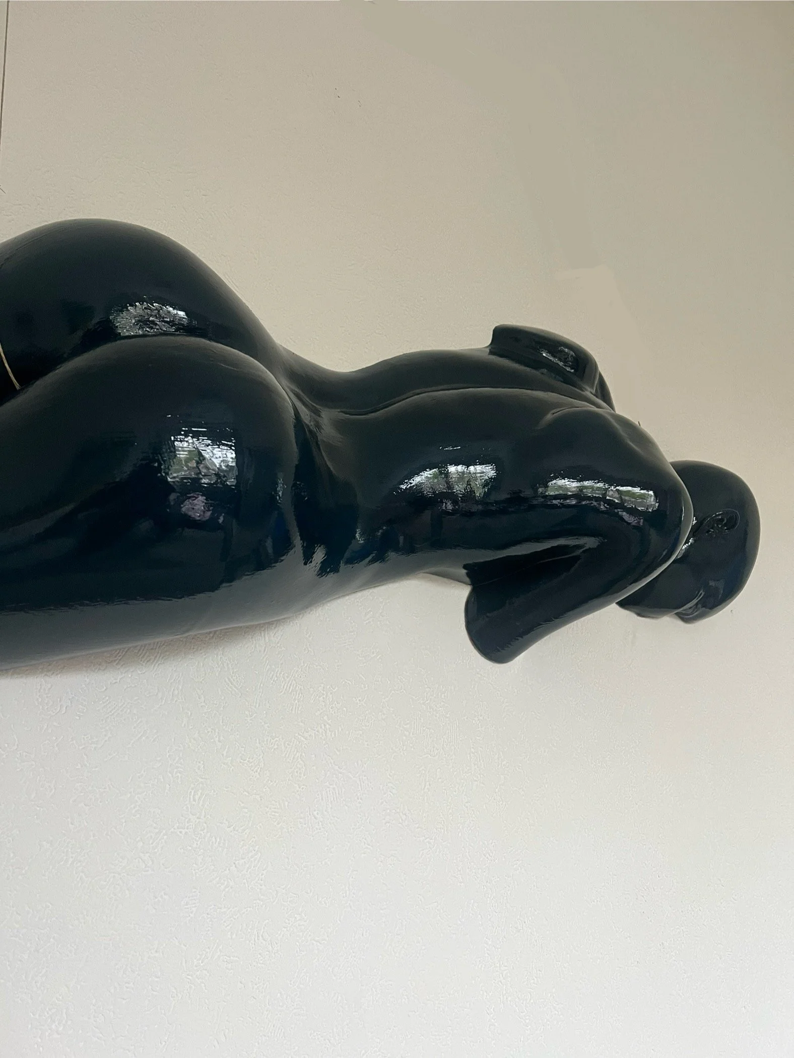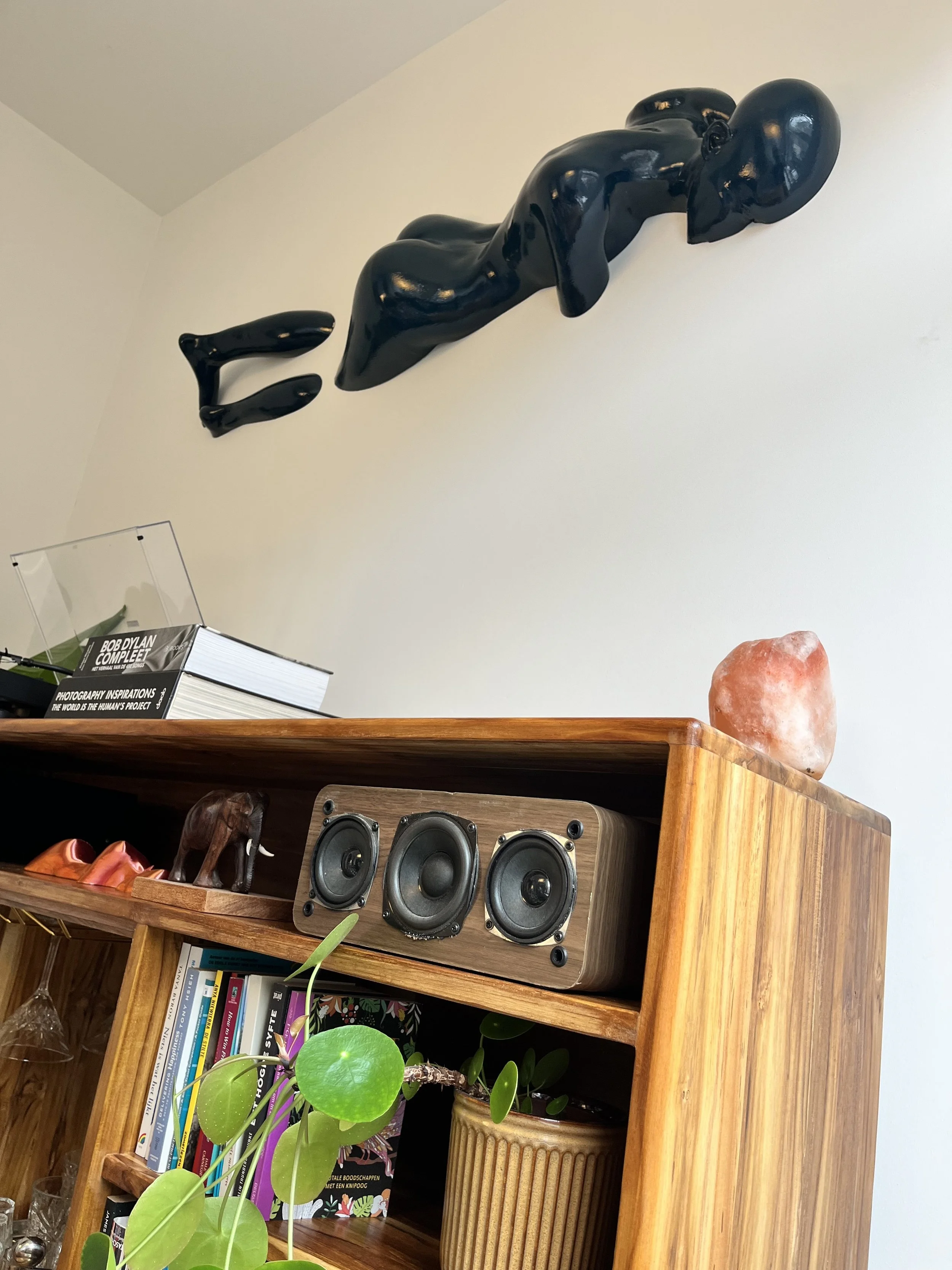 Crafted through a blend of 3D sculpting, hand-painted acrylic, and a glossy lacquer finish, the piece plays with light and reflection, echoing the shimmer of water over skin.